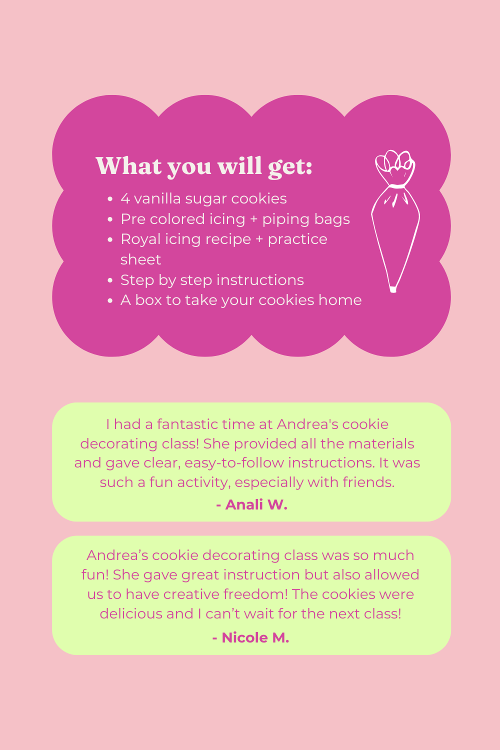 Your ticket includes access to all materials, tools, and guidance needed during the class. You’ll also take home the cookies you decorate.